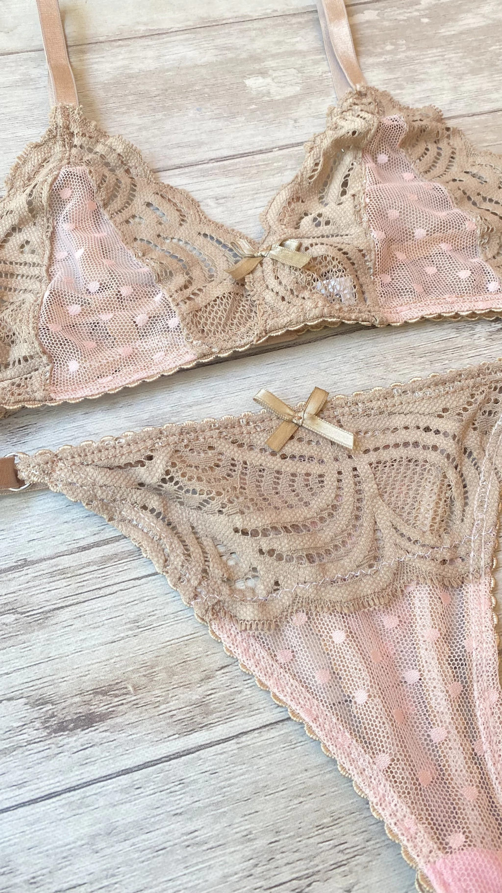 Está confeccionado en tul elastizado con motas en rosa combinado con puntilla elastizada tostada, que aporta comodidad y diseño