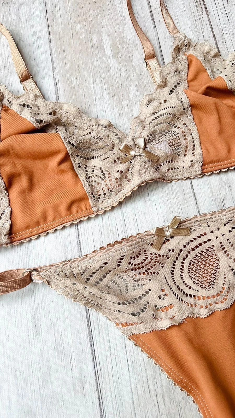 Está confeccionado en microfibra elastizada terra combinado con puntilla elastizada tostada, que aporta comodidad y  diseño